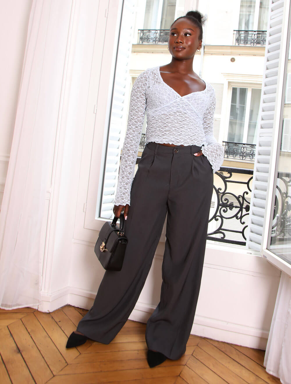 Une réunion prévue demain ? La dentelle se mue en un top élégant et épuré que l'on assemblera avec un pantalon de costume ample et bien coupé. Côté accessoires, des slingbacks vernies, une fine ceinture en cuir et un sac cartable pourront compléter le look avec brio !