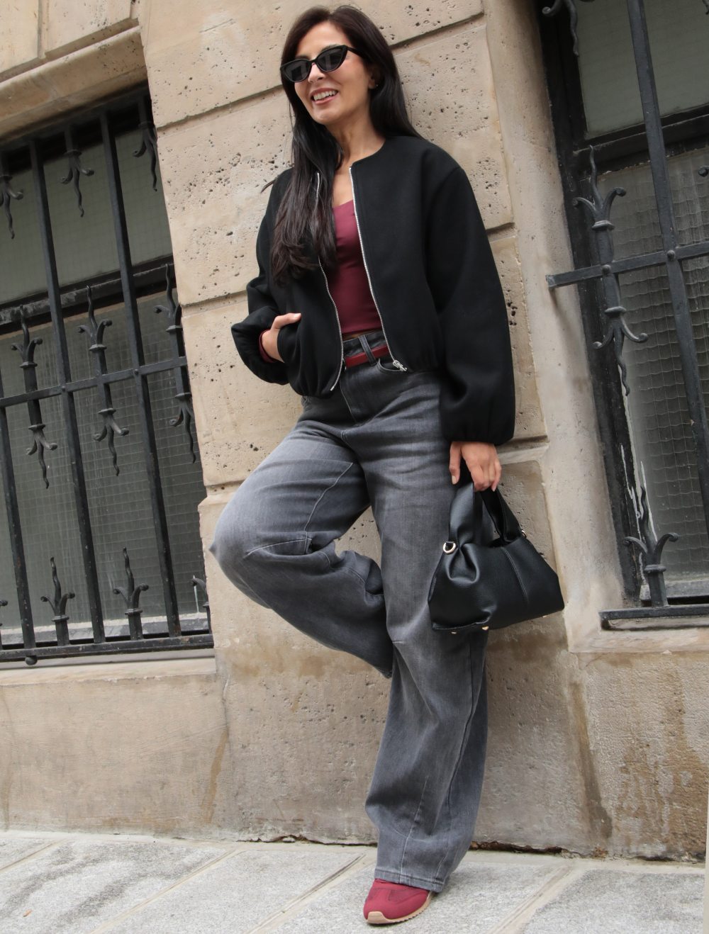 Ambiance urbaine avec un baggy gris foncé associé à un top bordeaux, teinte chaude et sophistiquée de la saison. La paire de baskets en suédine bordeaux vient parfaire cet ensemble pour un rendu à la fois cool et affirmé.