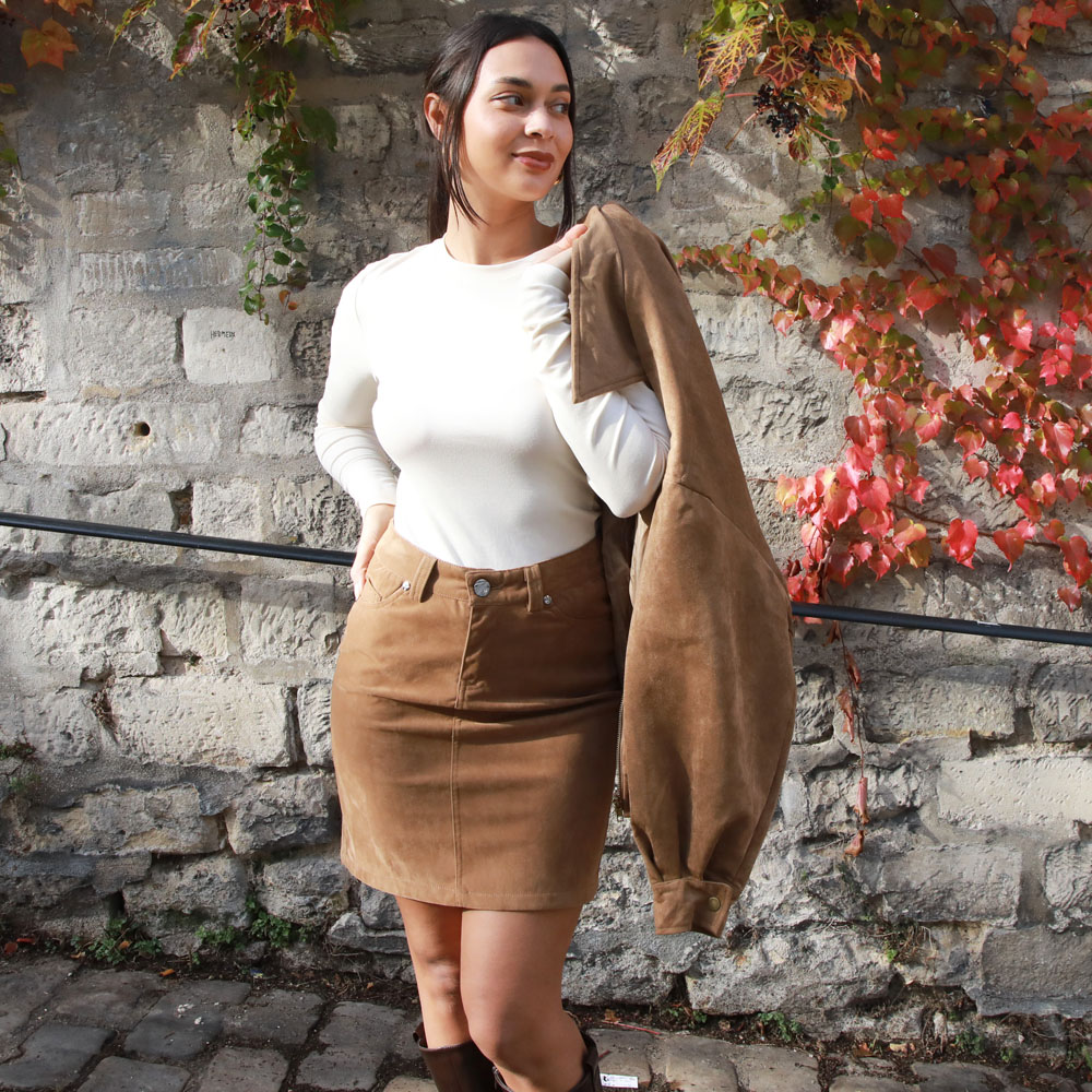 Douceur et allure intemporelle pour ce premier look. Une veste bomber en suédine associée à une jupe courte caramel pour un duo aussi tendance que chaleureux. On finalise la silhouette avec des bottes cavalières marron, pour une allure casual chic aux inspirations équestres. Un look parfait pour allier confort, élégance et modernité.