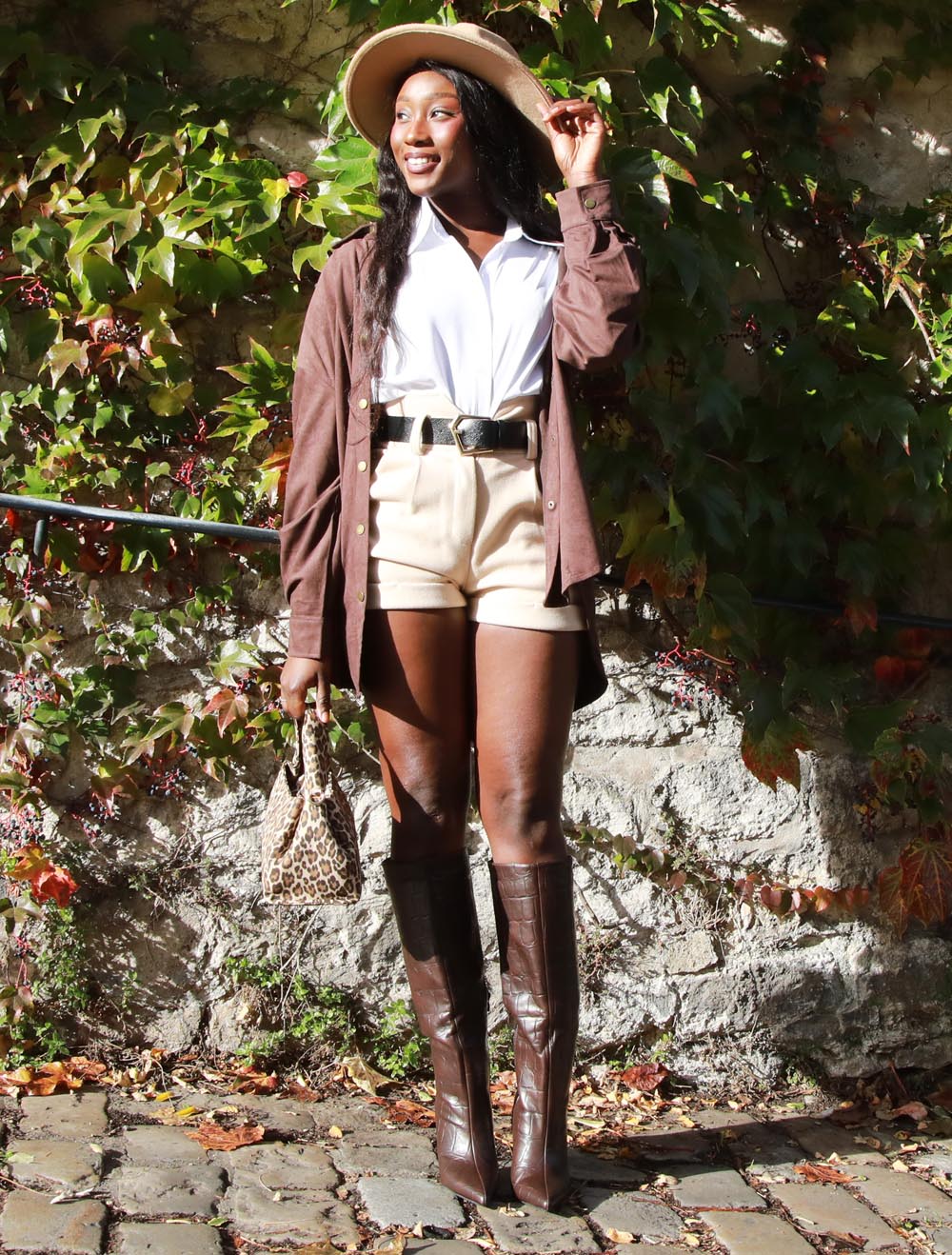 Un mélange de textures et d’attitude pour un look résolument mode. On mise sur un short en suédine associé à une chemise blanche immaculée, surmontée d’une surchemise épaisse en suédine marron. Le twist fashion : les bottes marron imprimé croco à talon aiguille qui allongent la silhouette et apportent cette touche glamour audacieuse. Une tenue idéale pour celles qui aiment oser avec style.