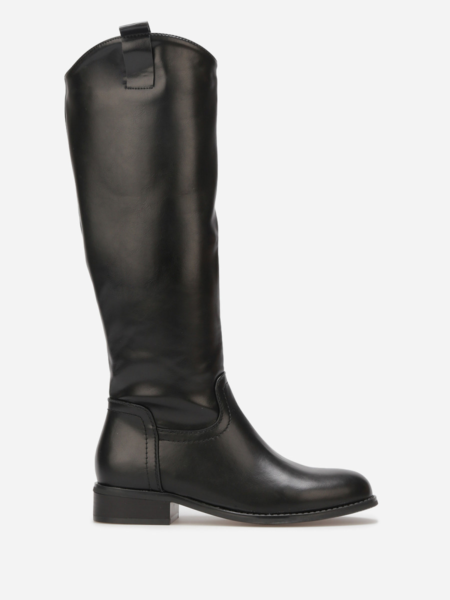 Bottes cavalières en simili avec languette côté extérieur.