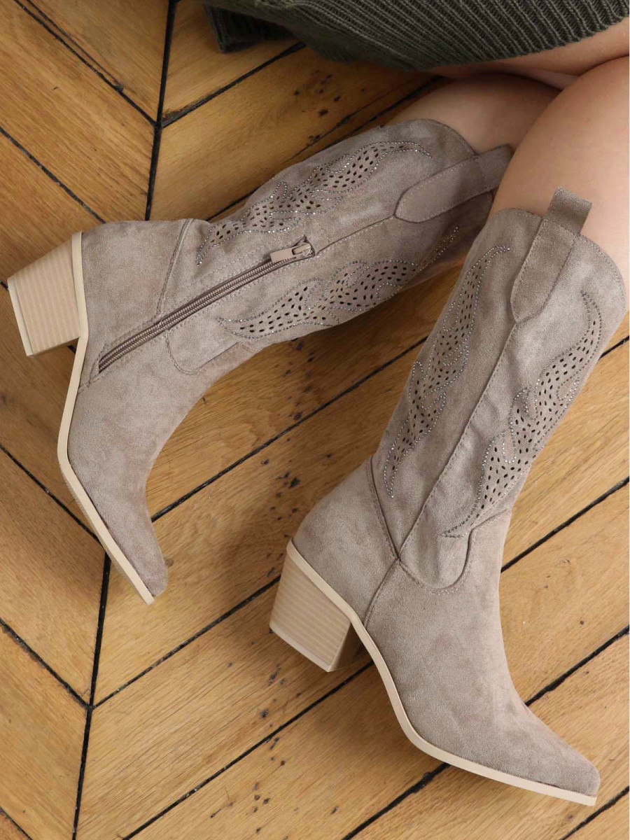 Santiags suédine avec flammes en strass - Taupe
