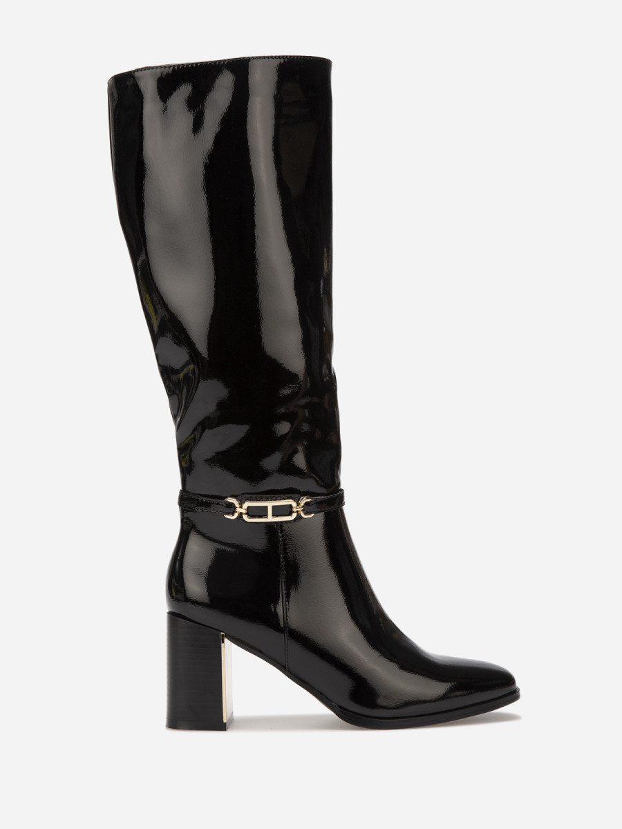 Bottes en simili cuir verni avec bijou métallique doré.