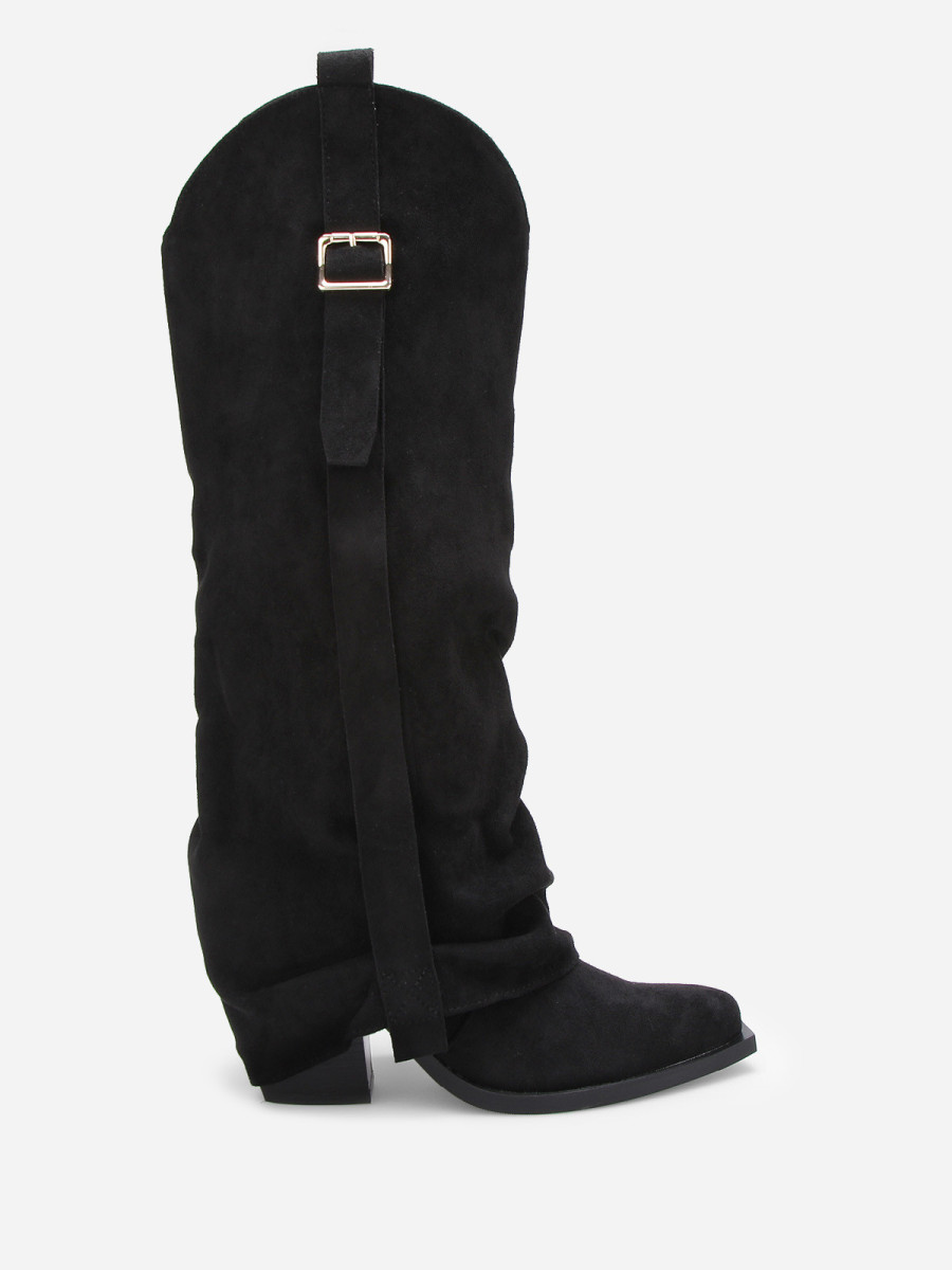 Bottes western en suédine avec fourreau souple et plissé à l'aide d'une sangle remontant jusqu'au haut de la tige.