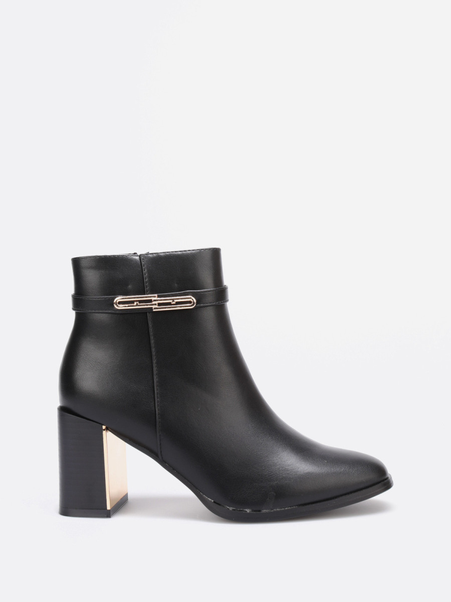 Bottines en simili cuir avec bride métallique doré.