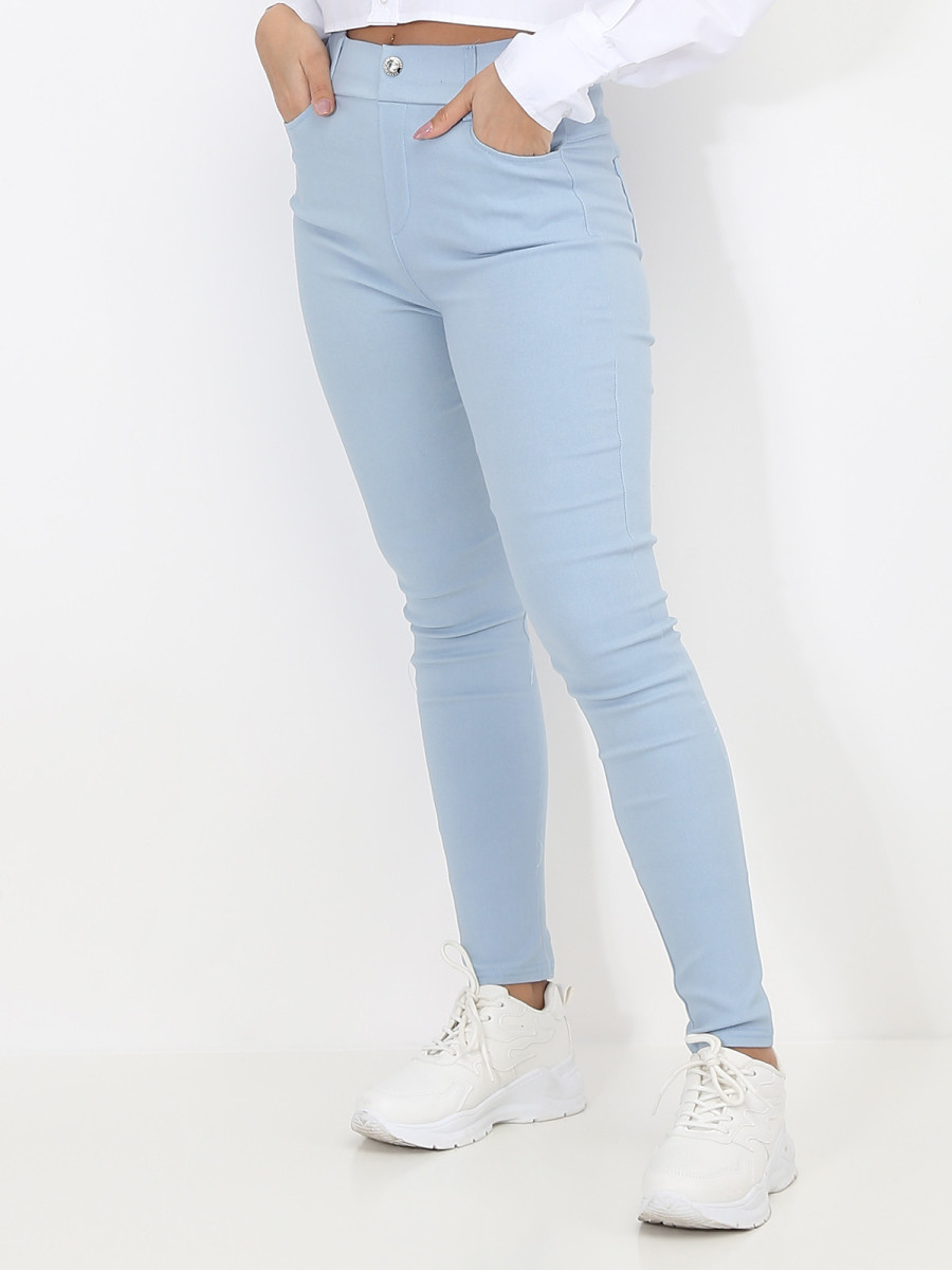 Pantalon skinny stretch à bouton strass - Bleu Clair