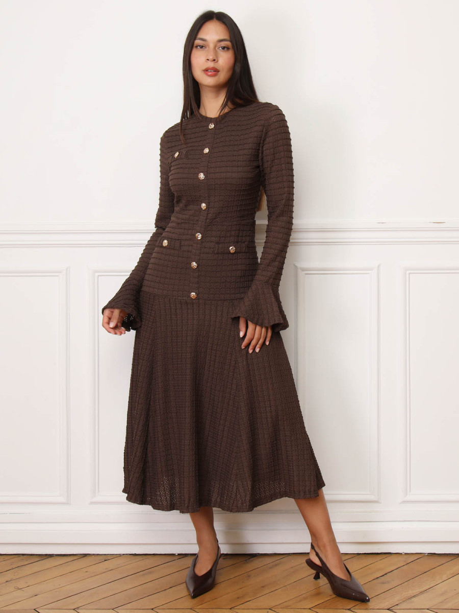 Robe évasée en maille ajourée et à boutons - Marron