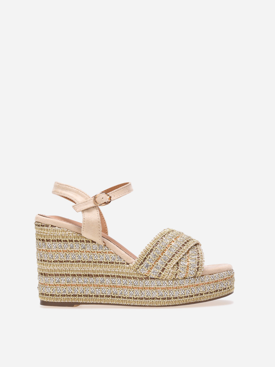 Sandales compensées à strass et brides croisées - Beige