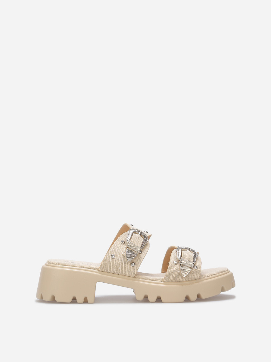 Mules dotées de 2 brides avec boucles et clous argentés.